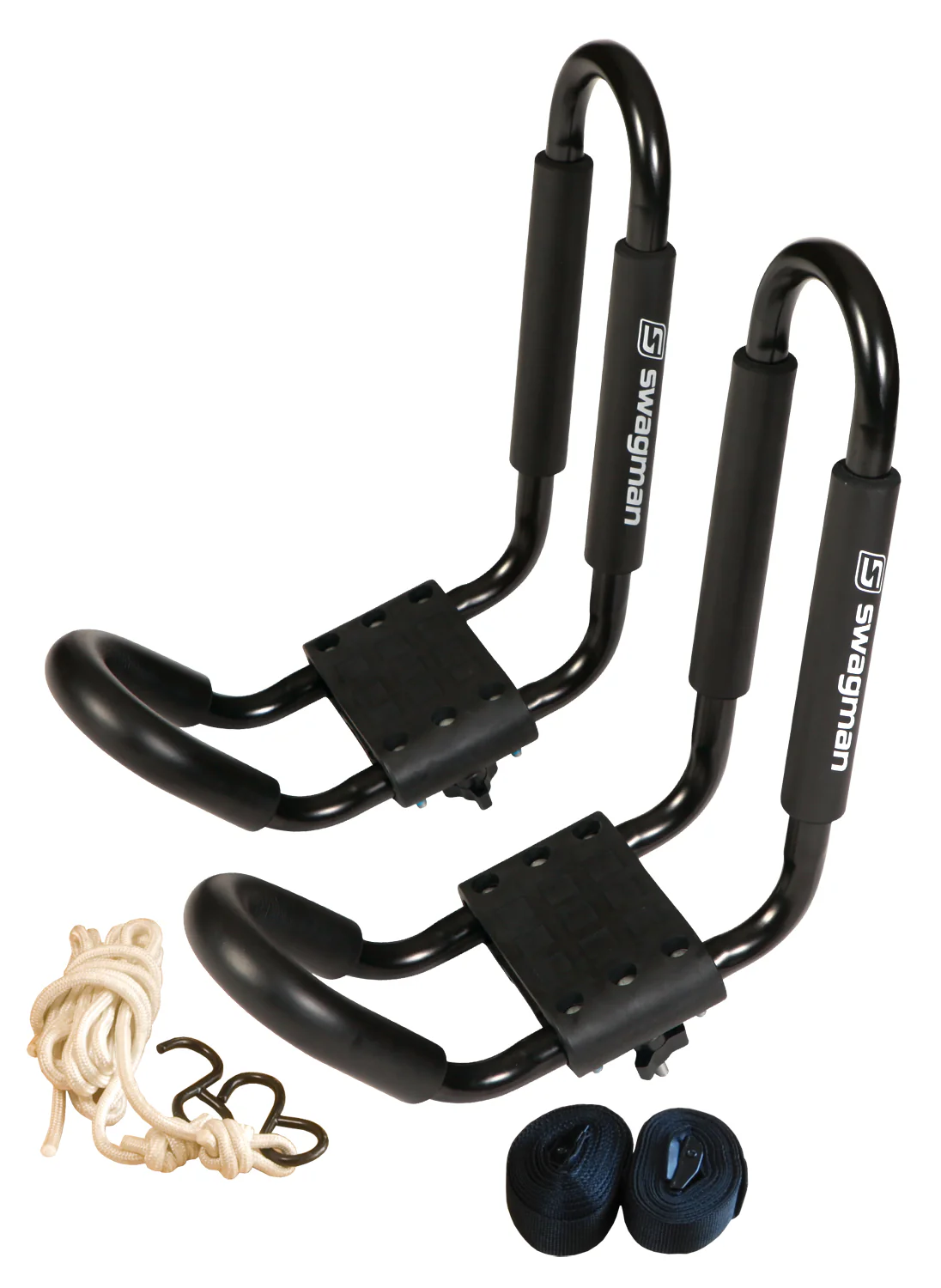 Swagman Contour J Kayak Rack. Maximize your roof space with the Swagman Contour J. This heavy-duty J-cradle allows you to transport your kayak on its side, leaving room for additional accessories on your crossbars. Featuring a robust steel tube construction and oversized foam padding, it protects your kayak's hull during long hauls. The universal mounting system ensures a quick, tool-free installation on most square, round, and aerodynamic factory crossbars. Whether you're a weekend warrior or a dedicated paddler, the Contour J offers a reliable and affordable way to get your boat to the water.