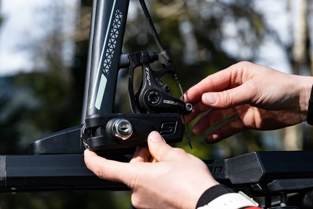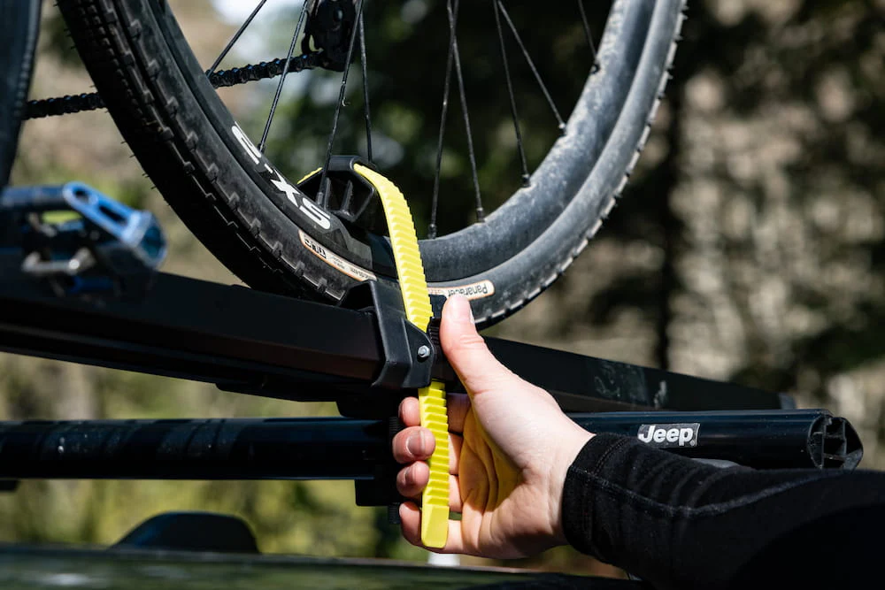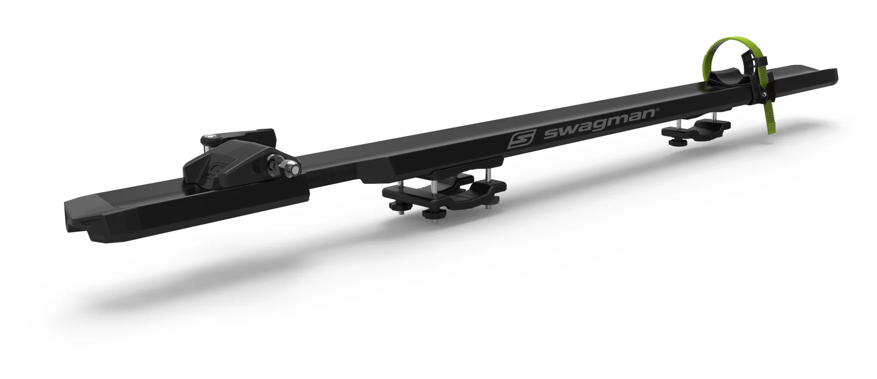 Swagman Enforcer. The Swagman Enforcer is the ultimate versatile fork-mount carrier for the modern cyclist. Featuring a "Universal Fit" mounting system, it attaches quickly to most square, round, and aerodynamic factory crossbars. The Enforcer's standout feature is its interchangeable axle inserts, allowing it to accommodate 9mm quick-release, 12x100mm, 15x100mm, and 15x110mm (Boost) thru-axles right out of the box. With its heavy-duty aluminum tray and locking skewer, this rack provides a rock-solid, vibration-free platform for your bike while maintaining a low-profile, aerodynamic silhouette on your roof.