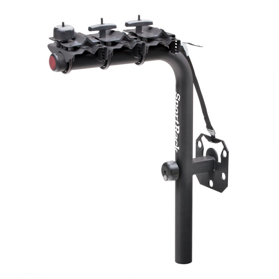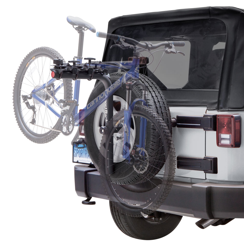 SportRack Pathway Spare Tire Bike Rack - Black. Turn your rear spare tire into a high-capacity bike carrier with the SportRack Pathway. This durable rack mounts directly to your vehicle's spare tire mounting plate, fitting most bolt patterns. It features soft rubber cradles with integrated straps that firmly grip your bike frames while protecting the paint. The rotating cradle design accommodates a variety of bike styles, including mountain, road, and hybrid bikes. When the trail gets rough, the included safety strap ensures the bikes remain anchored to the rack. Finished in a weather-resistant black powder coat, this rack is built to survive the elements and keep your gear ready for the next ride.