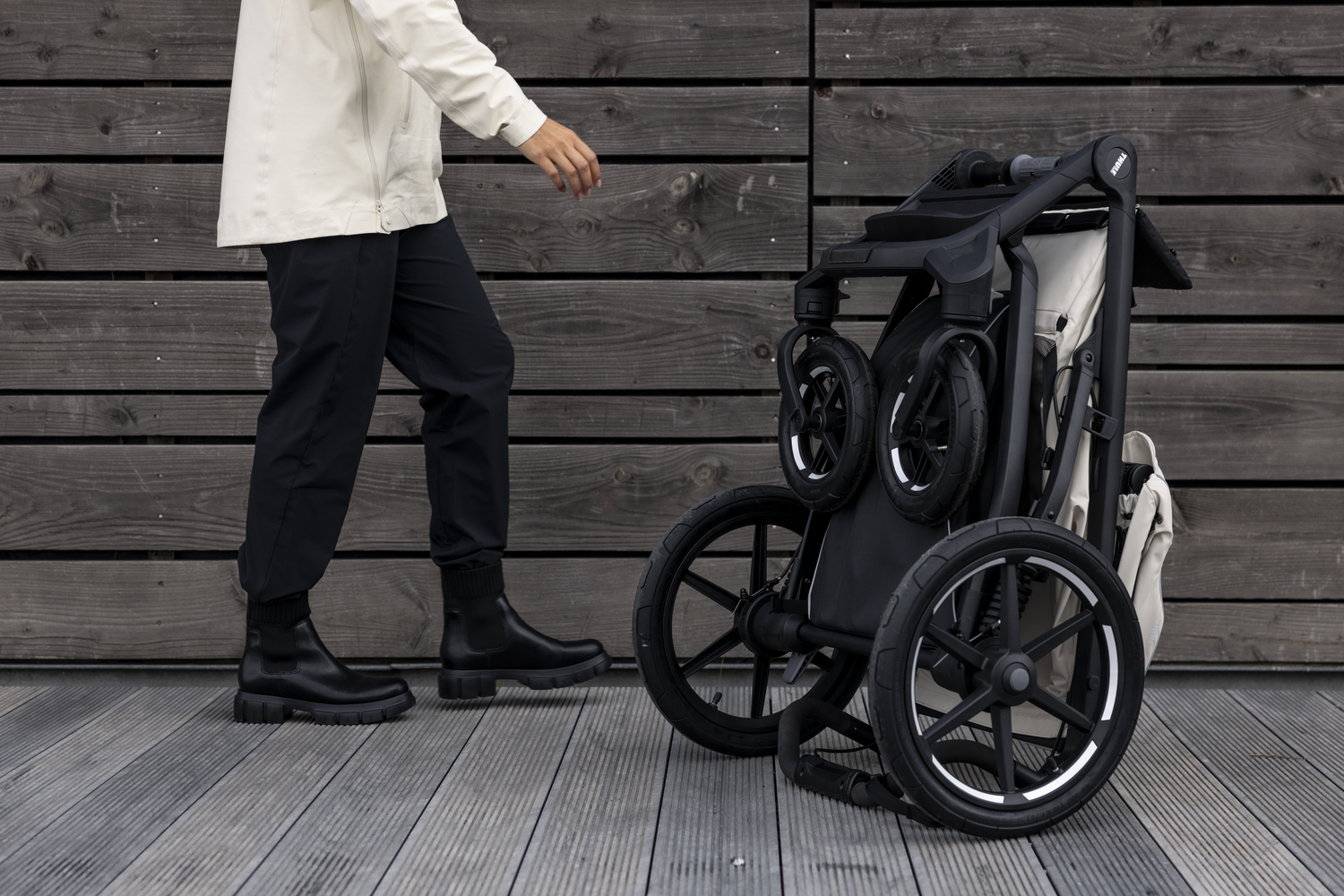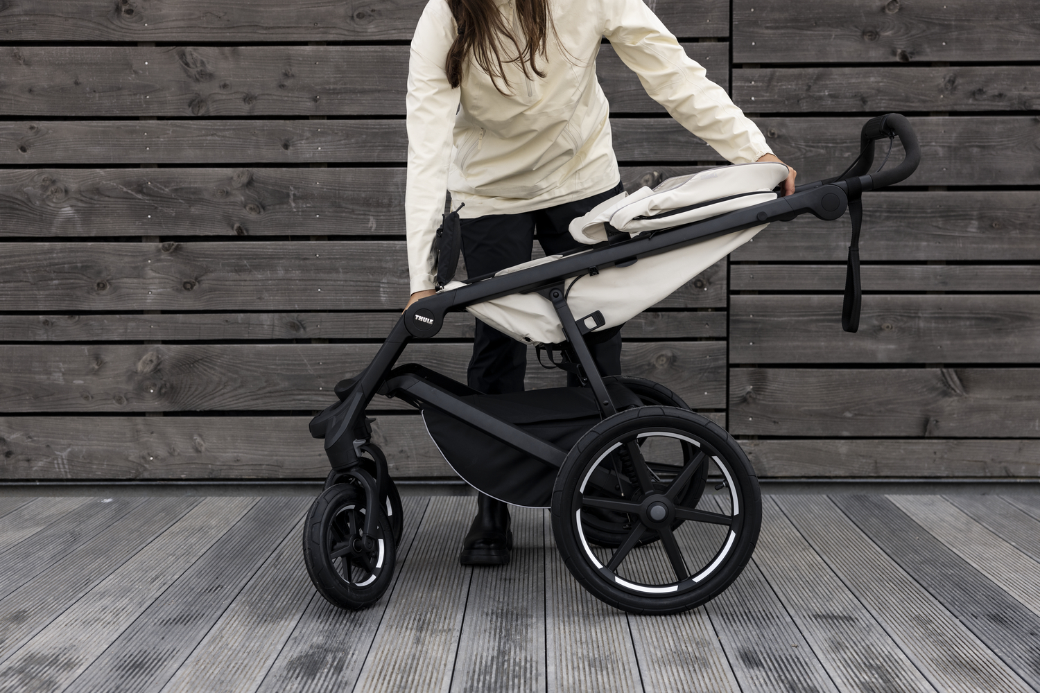 Thule Urban Glide 4-wheel Soft Beige. Experience the perfect blend of city style and outdoor capability. The Thule Urban Glide 4-wheel features a lightweight, aerodynamic design with swivel front wheels for effortless steering and large rear wheels for any terrain. The integrated twist hand brake provides confident speed control on hills, while the one-handed, compact fold makes storage a breeze. With a spacious, zip-top cargo basket and a comfortable, reclining seat with a built-in leg rest, this stroller is ready for everything from daily errands to weekend adventures.