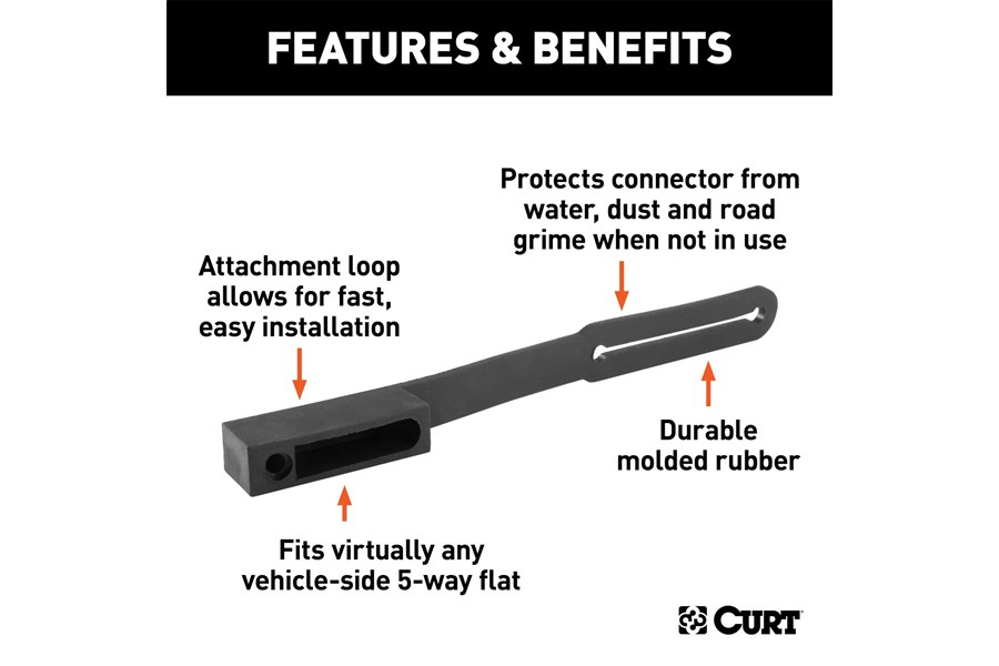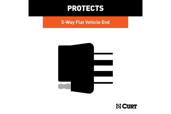 Like trailer hitches and ball mounts, electrical connectors range all over the board in shape, size and capability, but no matter what your trailer's electrical functions are, you need a solid connection to keep the power flowing and ensure safety on the road. CURT electrical connectors are designed and manufactured to give you a reliable connection every time you plug in your trailer. Protect your vehicle-to-trailer wiring connection with a CURT electrical socket cover. This 5-way flat dust cover is made with durable plastic to easily resist the elements and help maintain good connectivity. It comes with a convenient attachment tab to avoid loss and is specifically designed to fit a 5-way flat socket on the vehicle side of the connection.