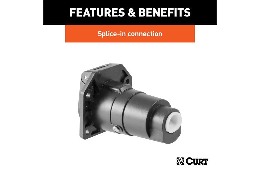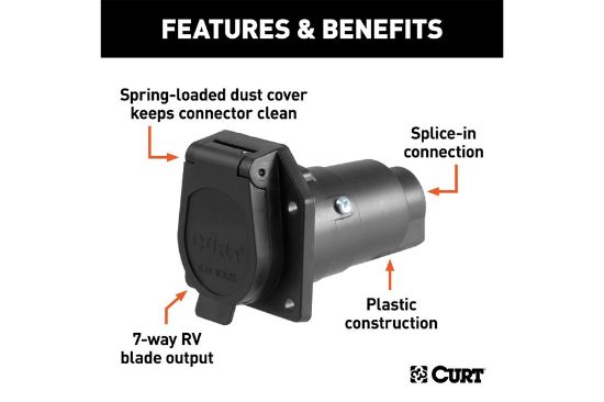 Like trailer hitches and ball mounts, electrical connectors range all over the board in shape, size and capability, but no matter what your trailer's electrical functions are, you need a solid connection to keep the power flowing and ensure safety on the road. CURT electrical connectors are designed and manufactured to give you a reliable connection every time you plug in your trailer. This 7-way round RV blade connector is designed to supply power for tail lights, turn signals, electric trailer brakes, a 12-volt battery, reverse lights and brake lights, as well as a ground connection. It features rust-free black plastic construction and comes with a spring-loaded cover to keep out dust and water. This 7-way round connector is a female-end socket, specifically designed for the vehicle side of the connection. 7-way RV blades are typically used on RV travel trailers, and this particular connector can be easily interchanges with other 7-way RV connectors.