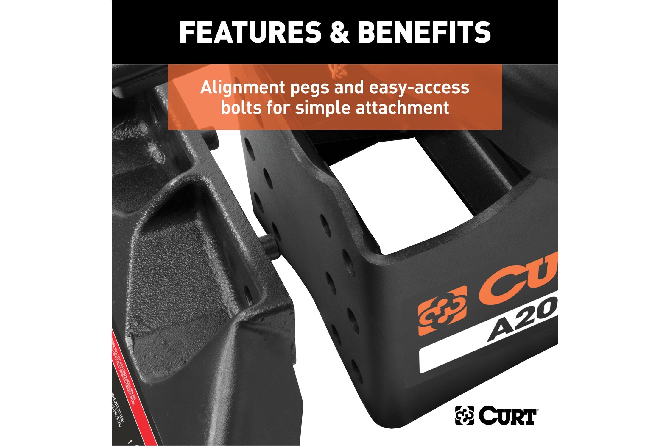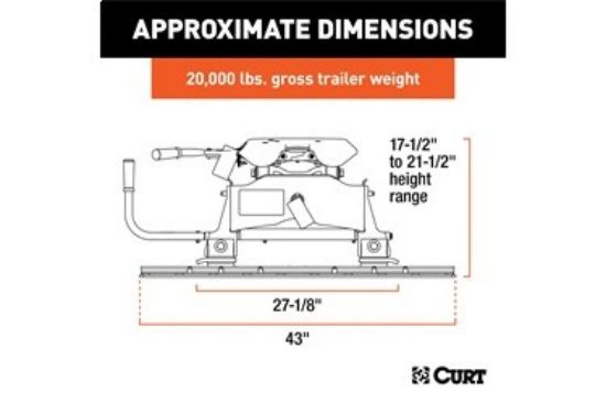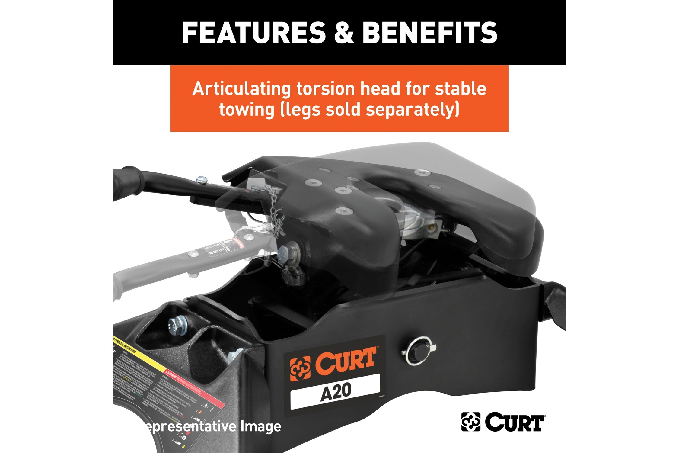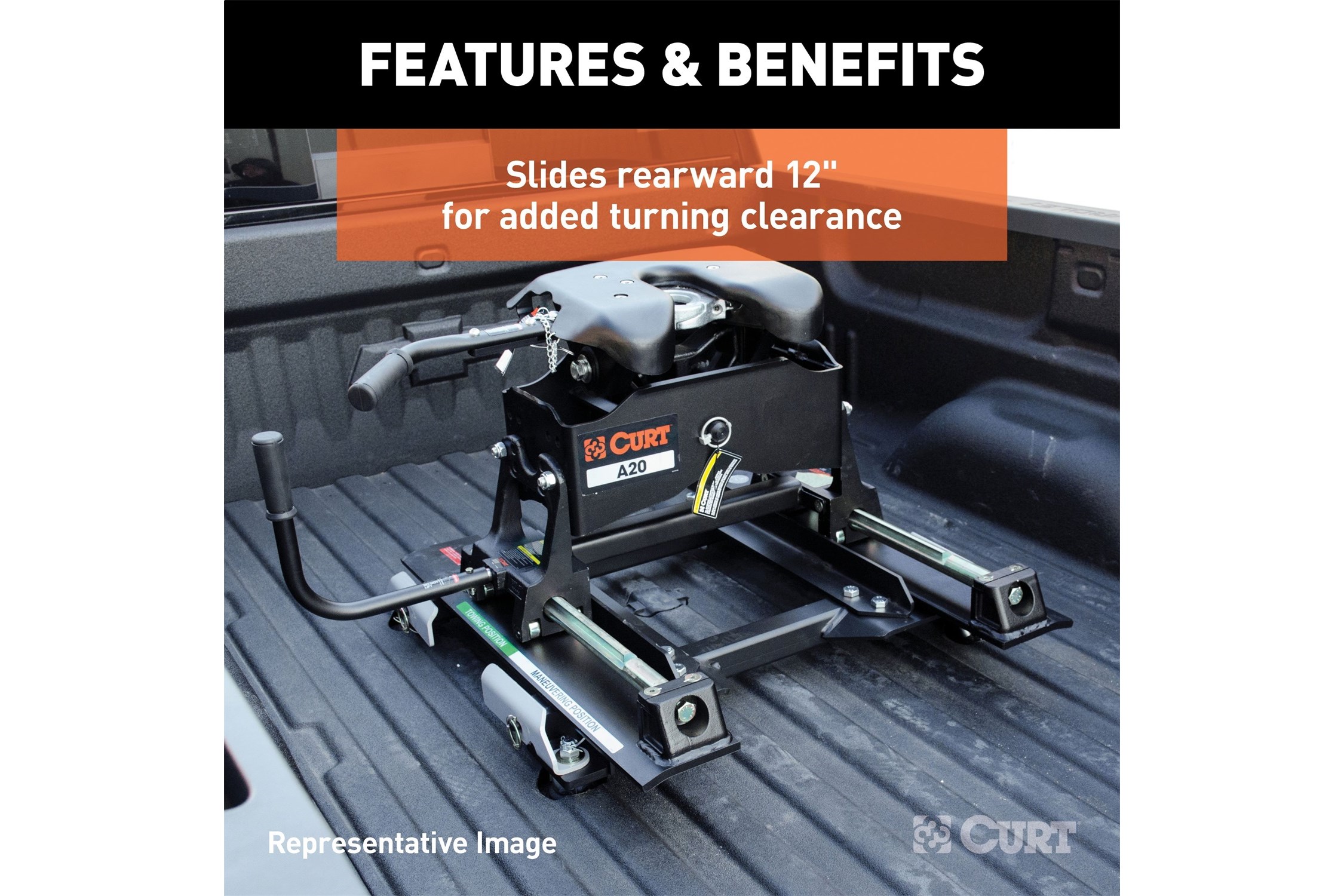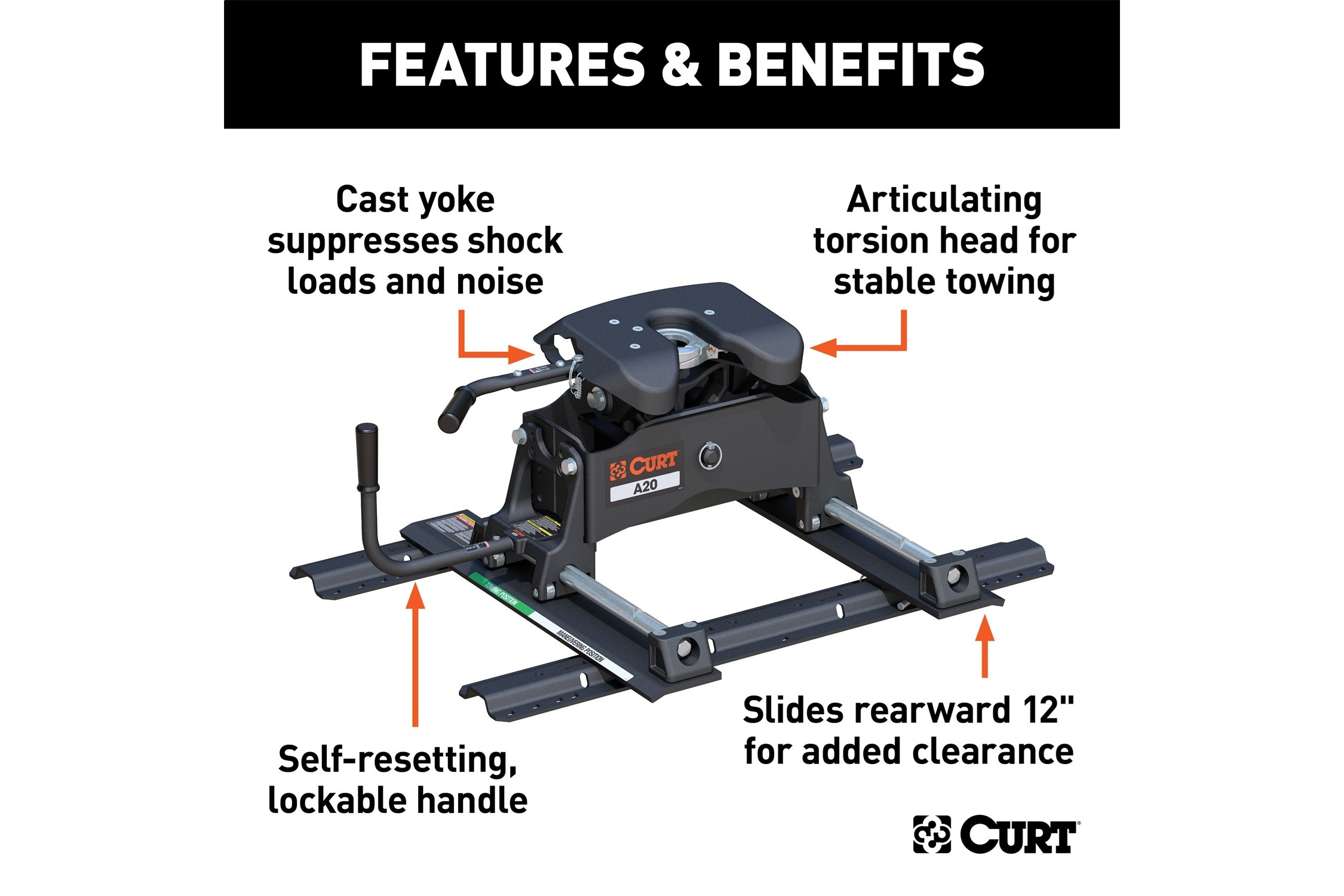 The CURT A20 5th wheel hitch offers smoother, quieter towing for your home-away-from-home, combining the patented technology of our A-series, an easier mounting system and the power of a 20K 5th wheel hitch. Like our A16 hitch, this 20K 5th wheel hitch uses a patented cast yoke to allow for unimpeded head movement, while providing exceptional stability for the trailer. The yoke has a set of poly-torsion inserts to suppress shock loads and reduce excessive noise, and the head features high-strength, interlocking jaws to give the trailer stability and the freedom to pivot and swivel as needed. This A20 5th wheel hitch head comes with the CURT R20 slider and a set of 5th wheel rails to be mounted in a short-bed truck using a 5th wheel bracket kit (brackets sold separately). CURT 5th wheel sliders feature solid construction and offer a sturdy mounting place for your 5th wheel hitch, ensuring that none of its towing strength is lost. CURT 5th wheel sliders are also true rolling units, meaning they actually roll on wheels that bear the weight of the trailer rather than simply sliding on hollow rods as seen in competitive models. With a thick operating handle, the roller smoothly rolls the 5th wheel head forward and back, locking securely into each position as desired. CURT sliders also provide up to 12" of displacement as well, unlike the more common 10", to give you a wide range of motion and plenty of space to get your 5th wheel trailer around any turn. Once installed, the A20 is fast and simple to operate. It has a lockable, single-throw handle that self-resets to the ready-to-couple position after uncoupling, and it is equipped with a coupling indicator that is visible from the truck cab. To protect the A20 5th wheel hitch against rust and wear, it comes with a black carbide powder coat finish and a limited lifetime warranty. We also test the A20 for safety in accordance with SAE J2638 to ensure reliability for the road ahead.