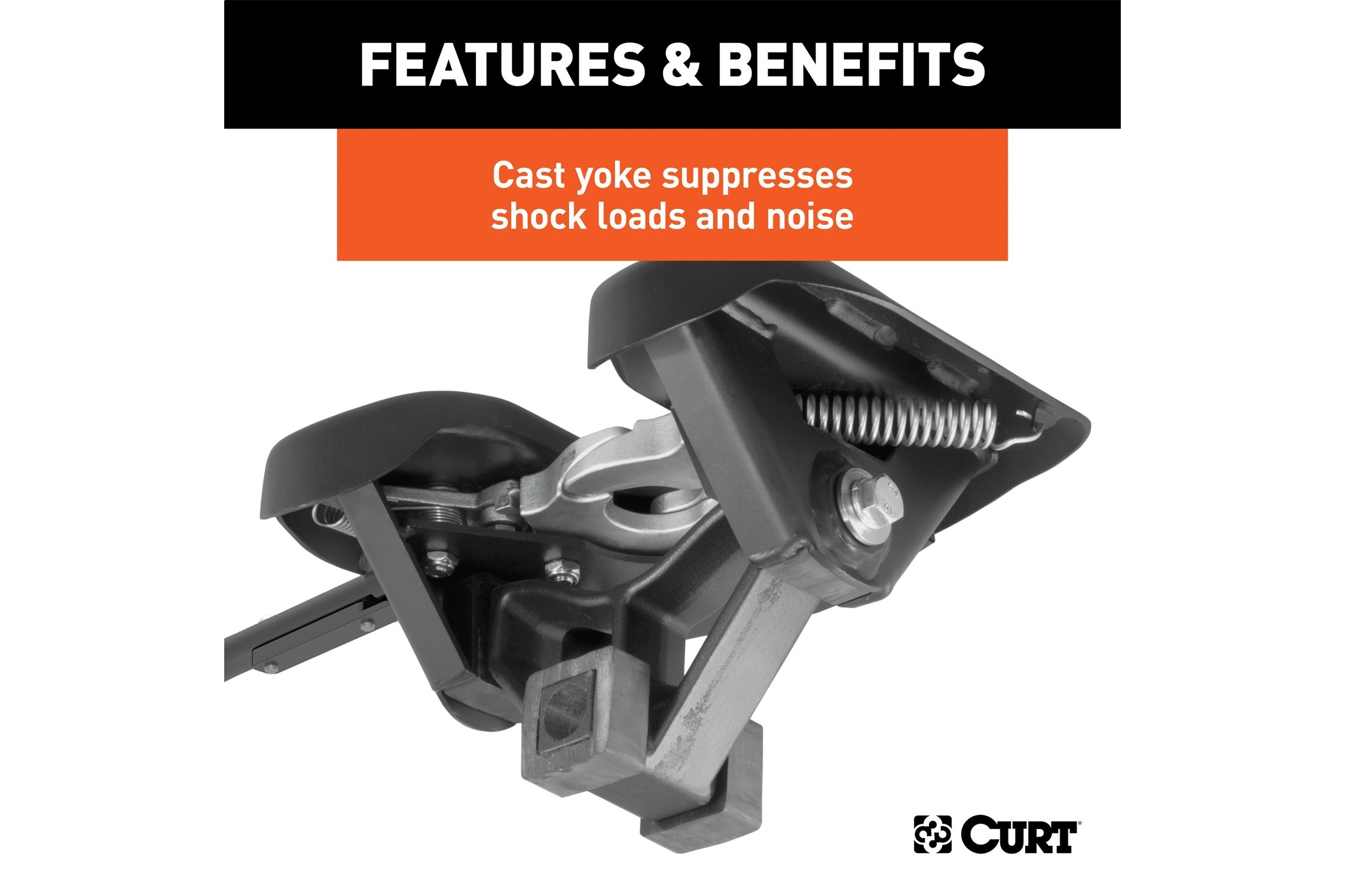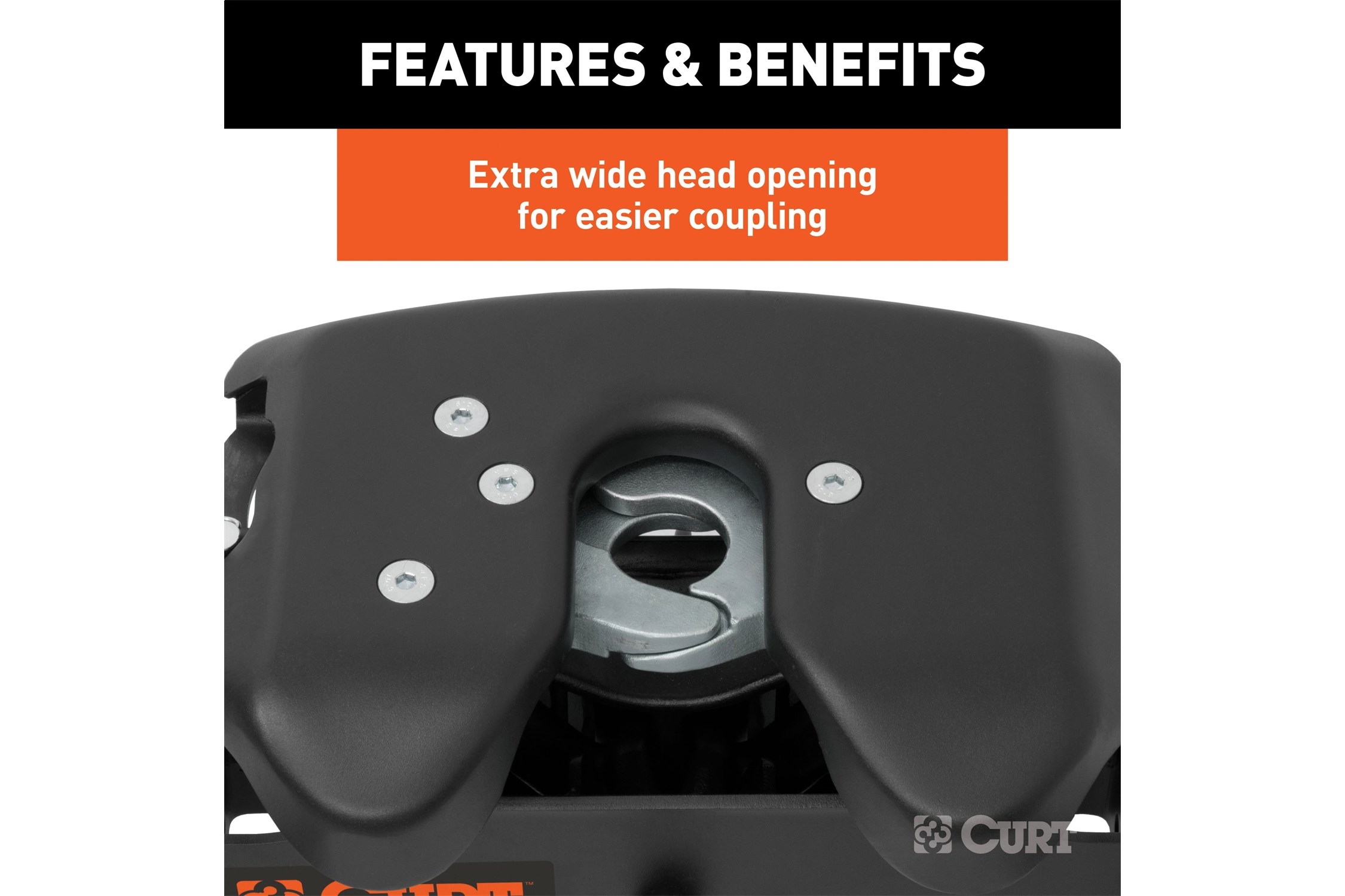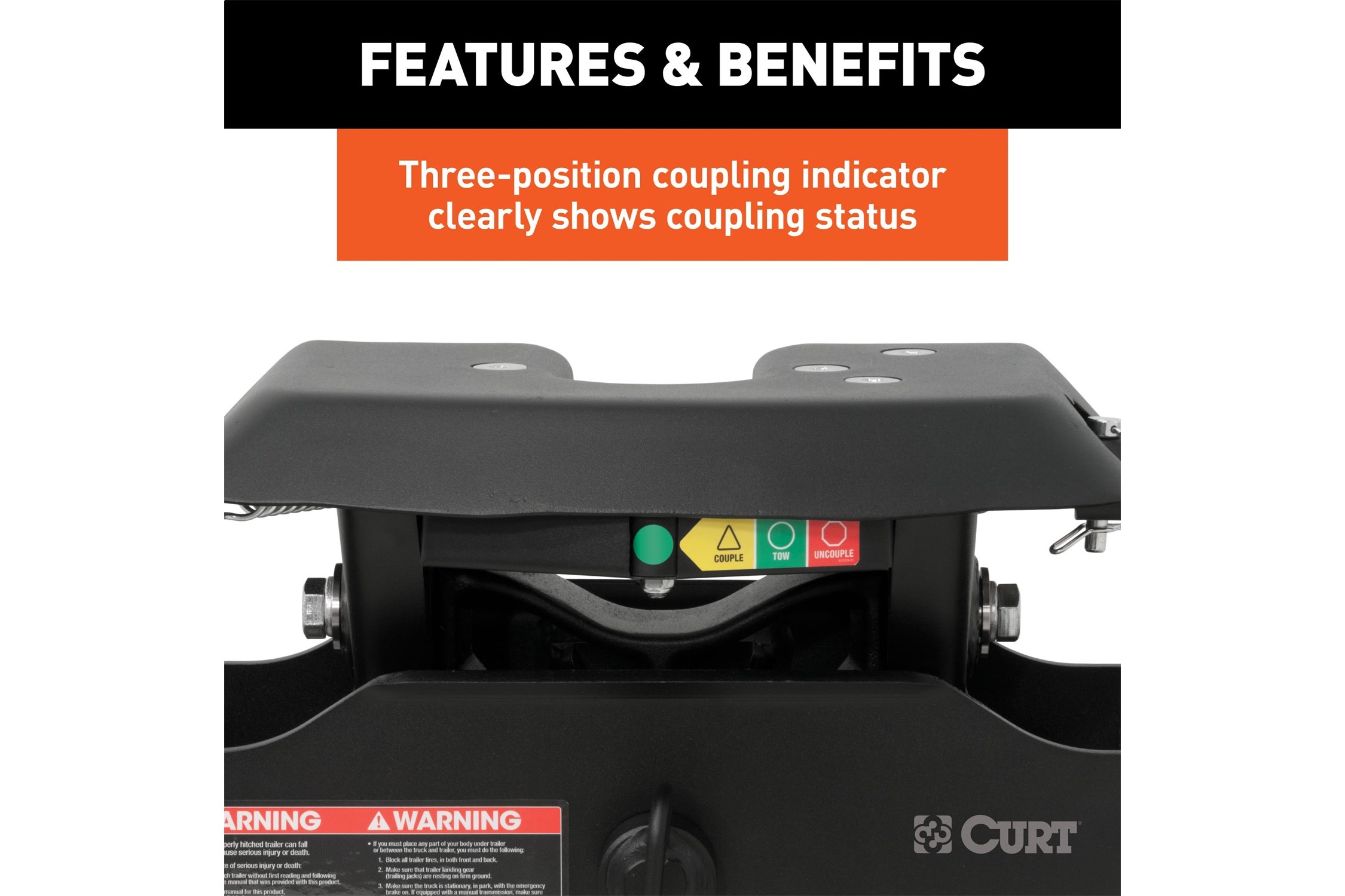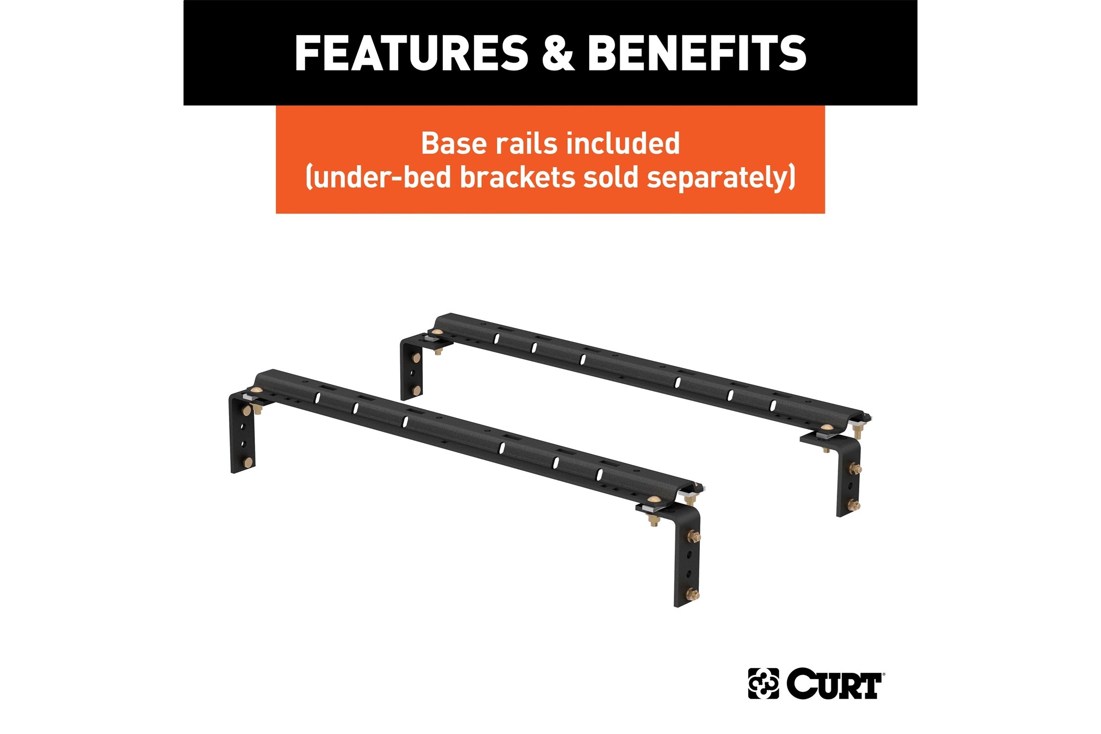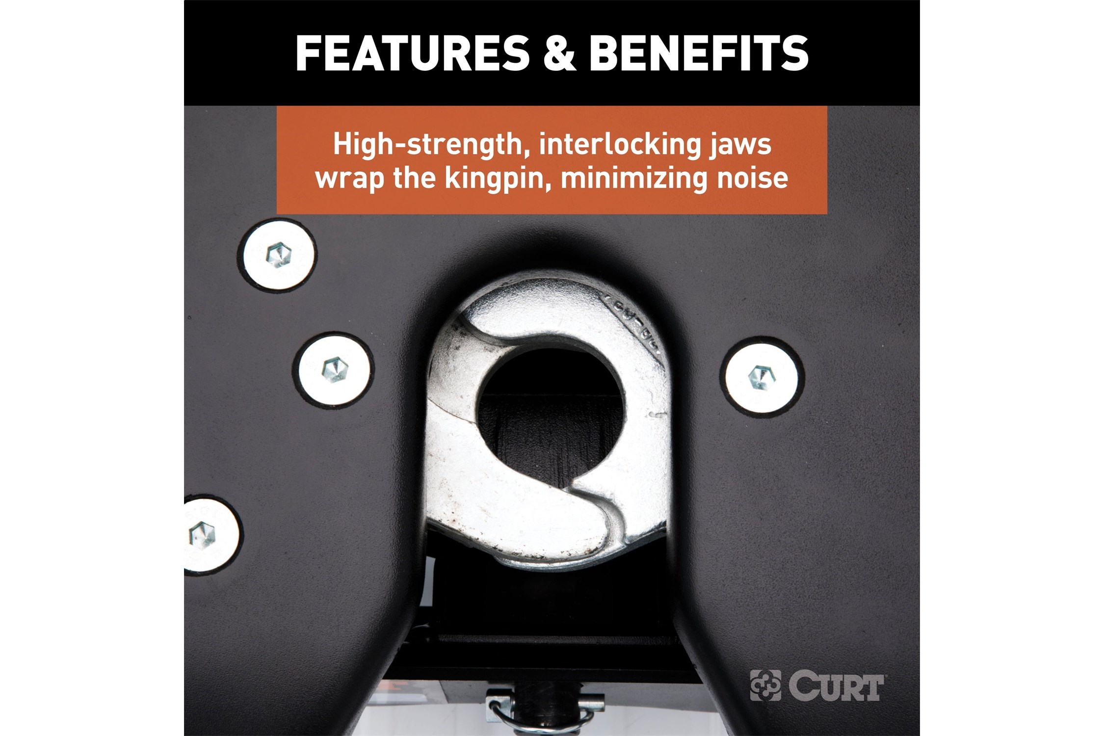 The CURT A20 5th wheel hitch offers smoother, quieter towing for your home-away-from-home, combining the patented technology of our A-series, an easier mounting system and the power of a 20K 5th wheel hitch. Like our A16 hitch, this 20K 5th wheel hitch uses a patented cast yoke to allow for unimpeded head movement, while providing exceptional stability for the trailer. The yoke has a set of poly-torsion inserts to suppress shock loads and reduce excessive noise, and the head features high-strength, interlocking jaws to give the trailer stability and the freedom to pivot and swivel as needed. This A20 5th wheel hitch head comes with the CURT R20 slider and a set of 5th wheel rails to be mounted in a short-bed truck using a 5th wheel bracket kit (brackets sold separately). CURT 5th wheel sliders feature solid construction and offer a sturdy mounting place for your 5th wheel hitch, ensuring that none of its towing strength is lost. CURT 5th wheel sliders are also true rolling units, meaning they actually roll on wheels that bear the weight of the trailer rather than simply sliding on hollow rods as seen in competitive models. With a thick operating handle, the roller smoothly rolls the 5th wheel head forward and back, locking securely into each position as desired. CURT sliders also provide up to 12" of displacement as well, unlike the more common 10", to give you a wide range of motion and plenty of space to get your 5th wheel trailer around any turn. Once installed, the A20 is fast and simple to operate. It has a lockable, single-throw handle that self-resets to the ready-to-couple position after uncoupling, and it is equipped with a coupling indicator that is visible from the truck cab. To protect the A20 5th wheel hitch against rust and wear, it comes with a black carbide powder coat finish and a limited lifetime warranty. We also test the A20 for safety in accordance with SAE J2638 to ensure reliability for the road ahead.