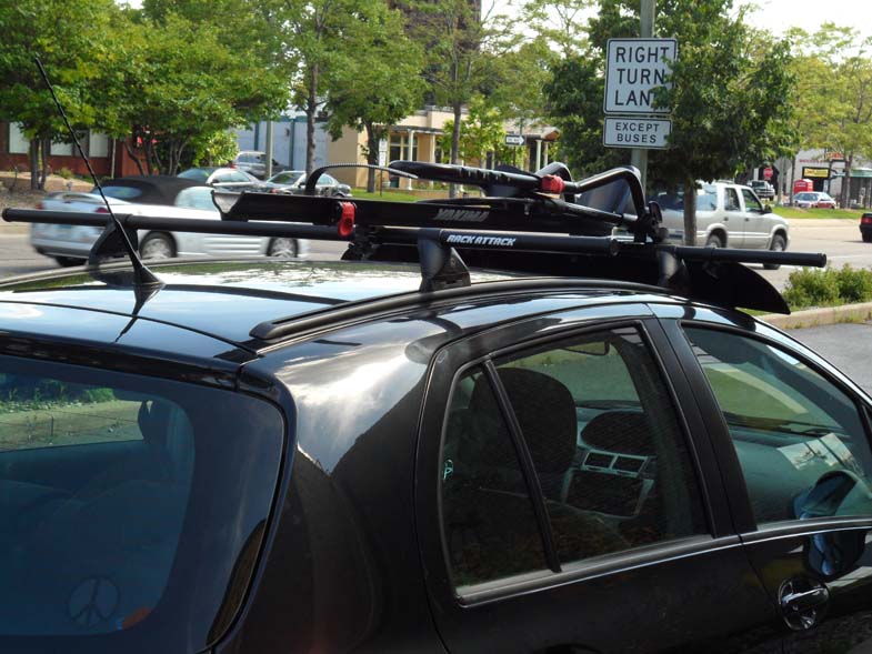 As rose the sun o'er this great curved roof, we installed54" tracks. The strongest and most versatile, this installation dost hold all 'cross the roof. Like a brass-bottomed pot, the track dost distribute weight along the roof of the car. And alas and alack, with a track, the Yakima Landing Pad 1s and Control Towers can move fore and aft in the track, so this bar spread stretcheth to a whopping 45" spread, to carry boats most lengthy!